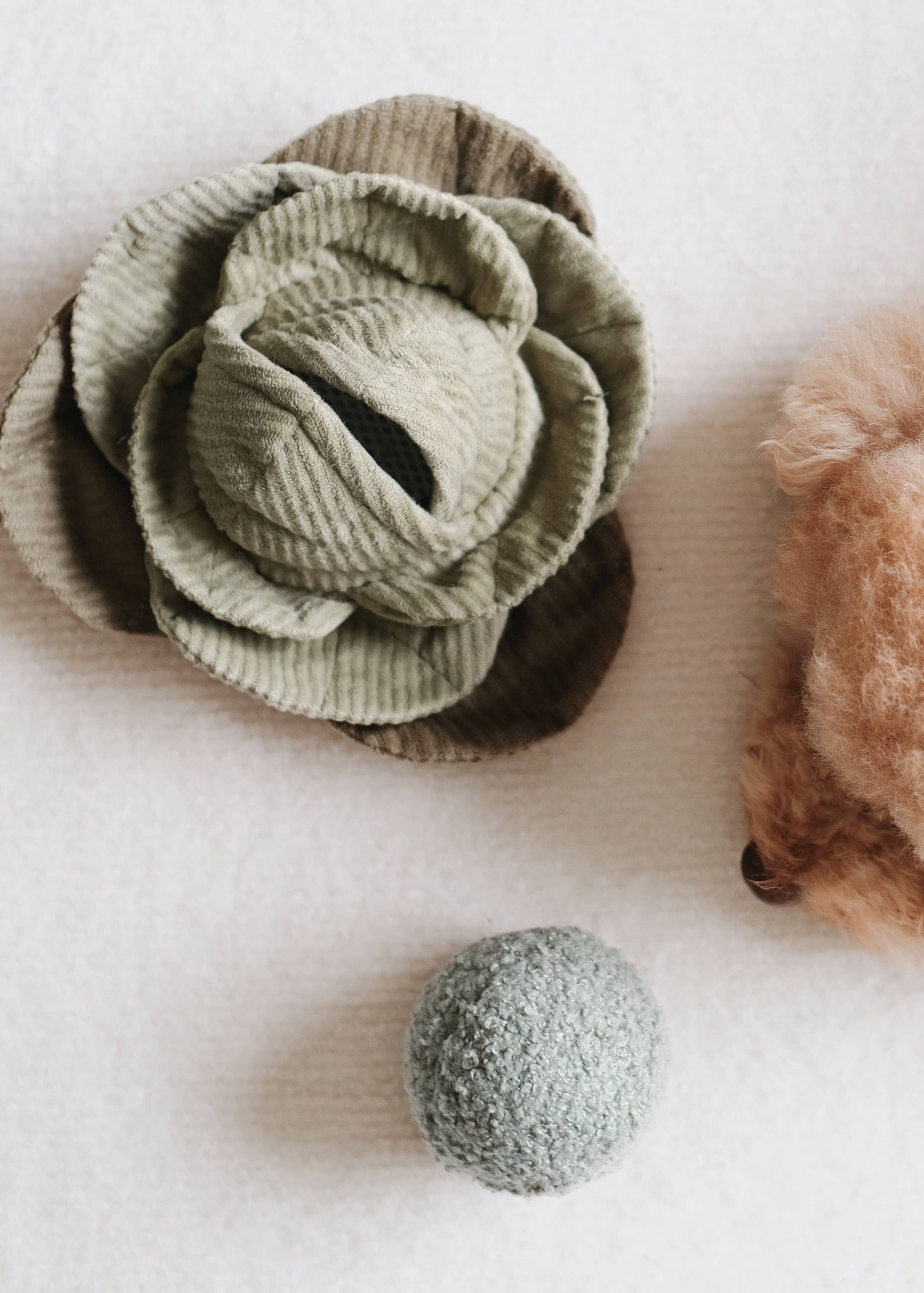 The cabbage outer layer is made from softly crinkling leaves that add extra sensory excitement and allow you to hide treats between them for rewarding sniff sessions. At the centre of the cabbage sits a bouncy squeaky ball, ready to challenge curious pups to sniff, nudge, and pull it out!